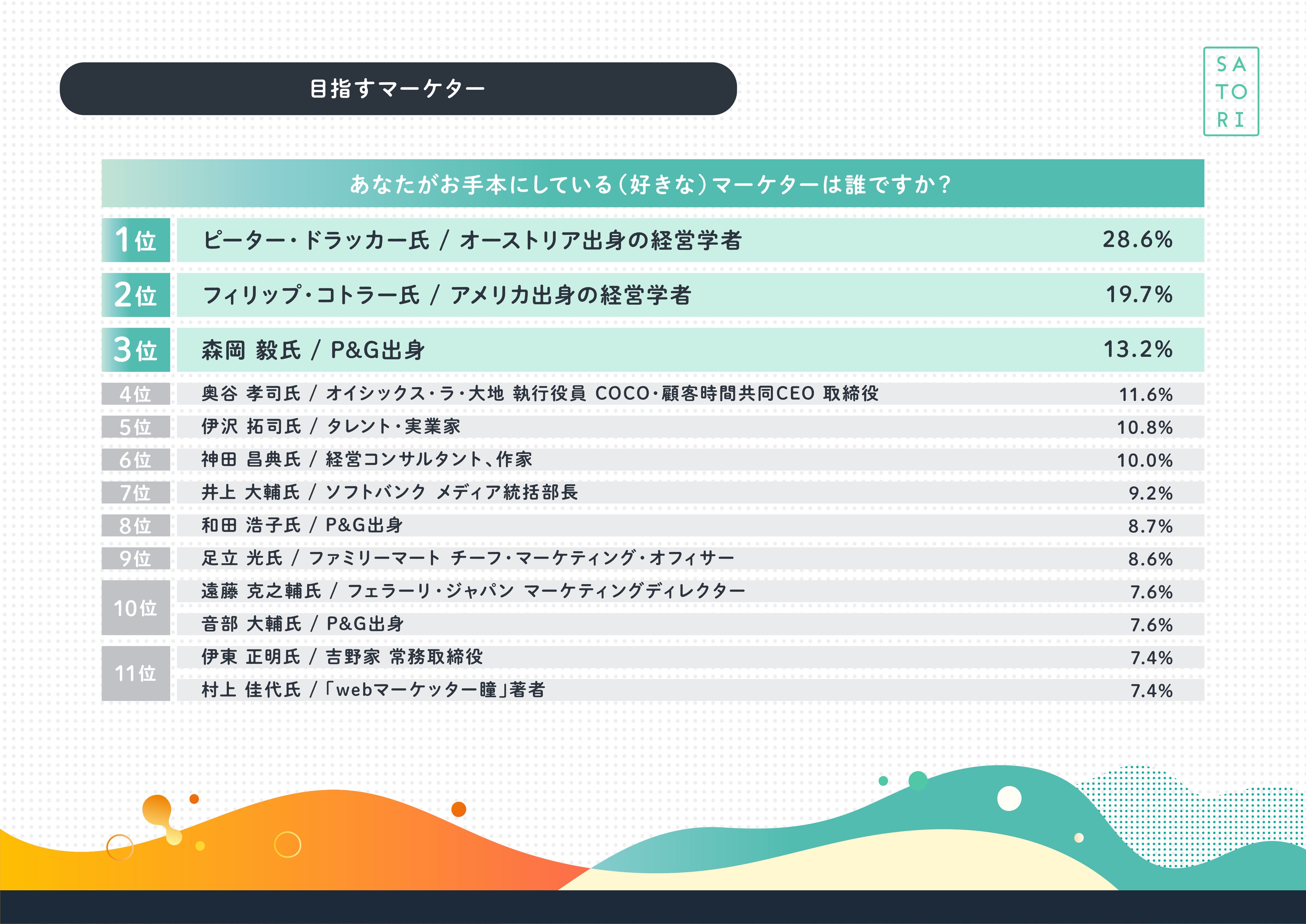 - 企業のマーケティング従事者がお手本にしているマーケターは、ピーター・ドラッカー氏(28.6%)とフィリップ・コトラー氏(19.7%)。日本人では森岡毅氏(13.2%)、奥谷幸司氏(11.6%)、が上位に。