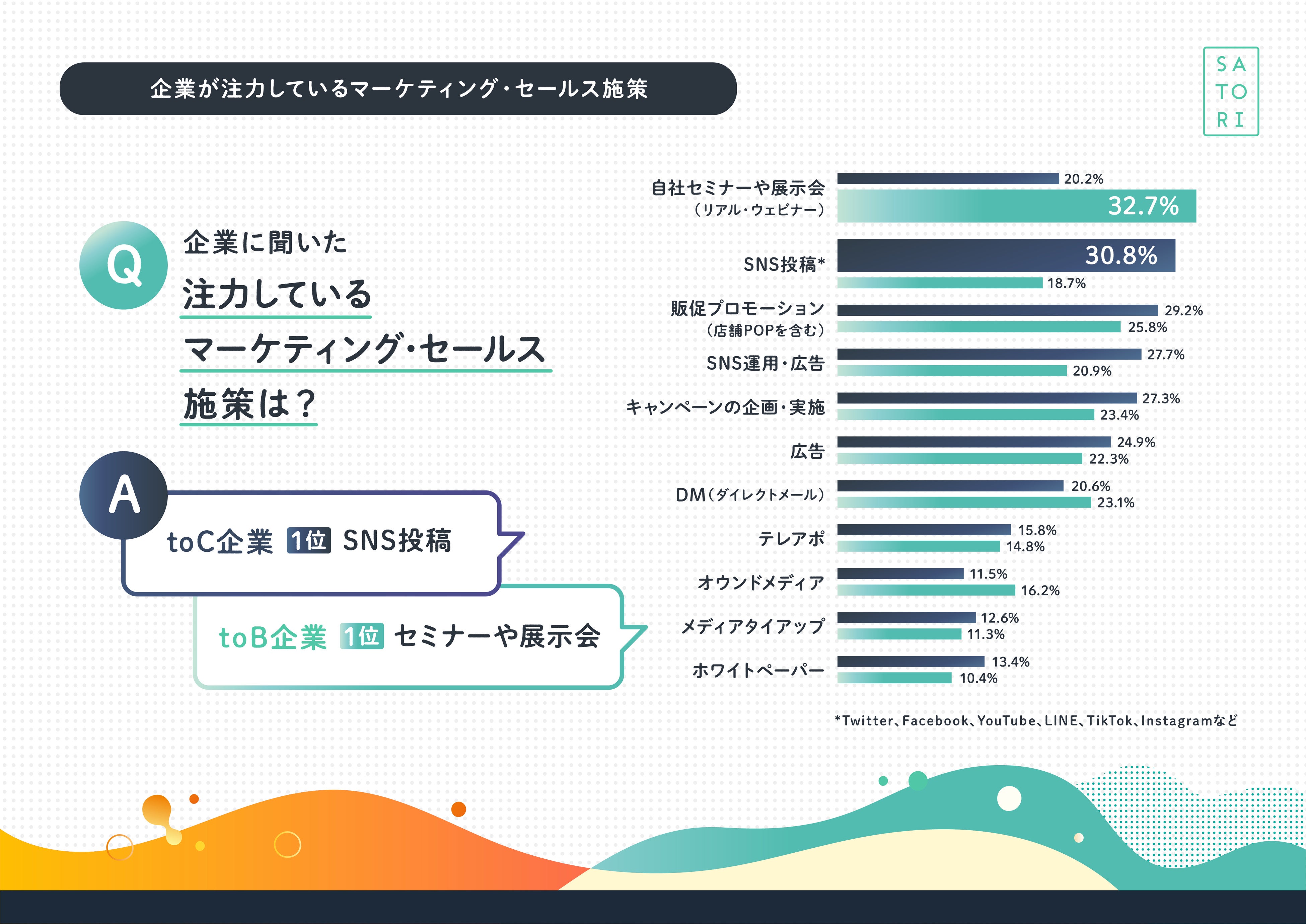 - 現在注力するマーケティング施策は、toB企業では「自社セミナーや展示会」(32.7%)など新規顧客獲得のための施策が上位に。toC企業では生活者と直接コミュニケーションがとれるSNS施策が上位に。