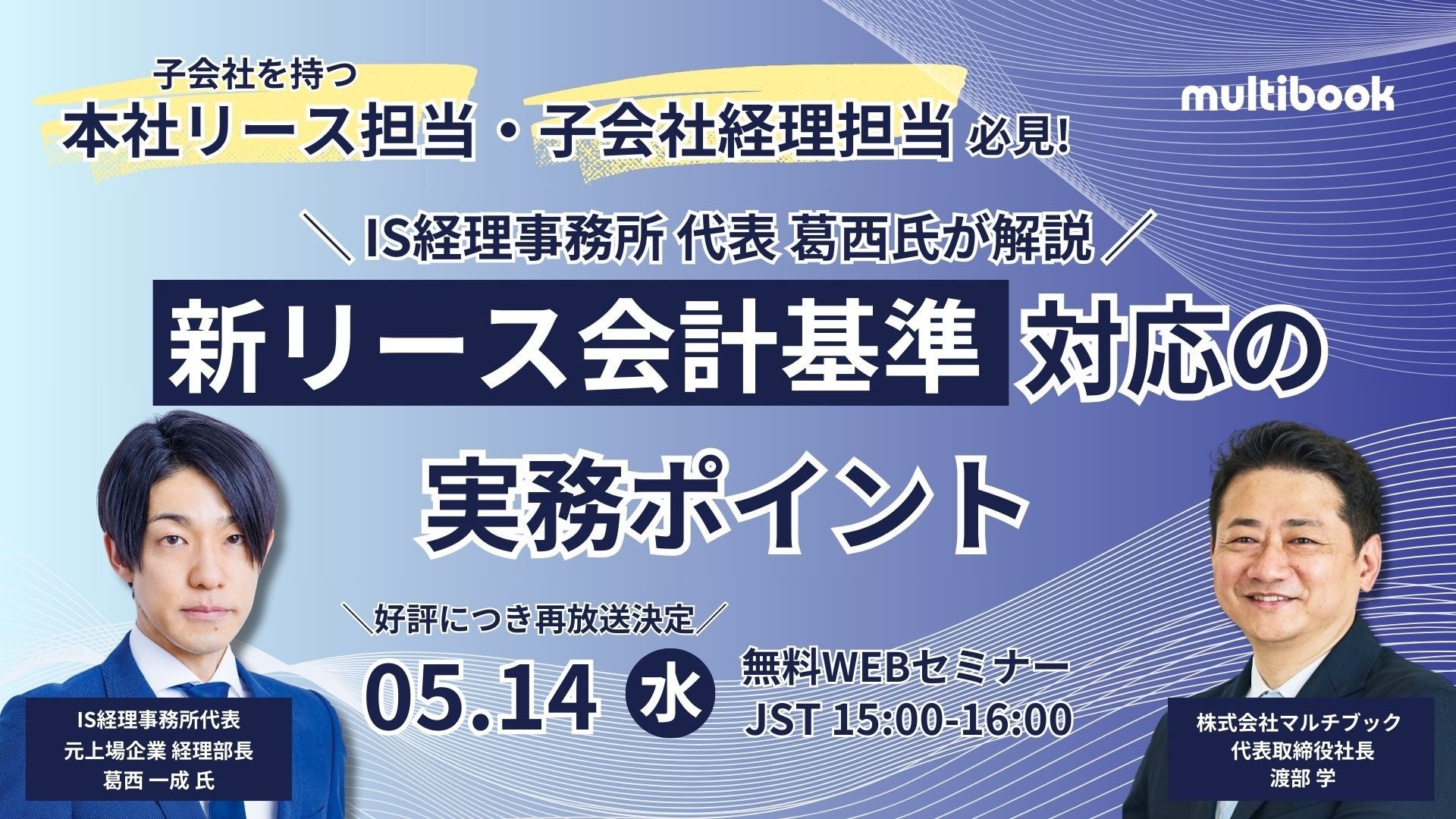 海外拠点を持つ企業の経営管理を支援するグローバルクラウドERPサービス「multibook(マルチブック)」を提供する株式会社マルチブック(東京都品川区、代表取締役社長:渡部 学)は、IS経理事務所(代表 葛西 一成 氏)と共同で3月に開催されたWebセミナー、「親会社の決算担当者・子会社の経理担当者必見!新リース会計基準対応の実務ポイント」を好評につき、再放送いたします。