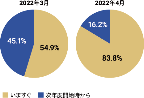 保育士バンク!の利用実績を元に、当月の園の募集要件で、入職するタイミングが「いますぐ」なのか「次年度開始時」なのかの割合を算出、前月と比較。