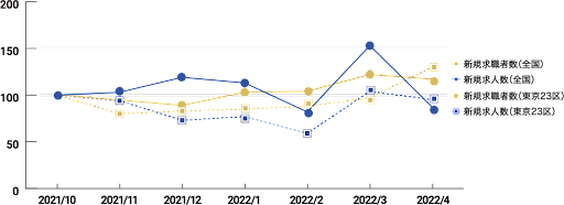 *2021年10月を100とする保育士バンク!の利用実績を元に、月ごとの求職者数と保育園・幼稚園等の求人数の新規登録実績を、時系列で算出。