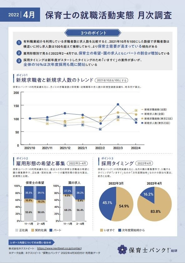 | ~ 3つのポイント ~ 1. 有料職業紹介を利用している求職者数と求人数を比較すると、2021年10月を100にした数値で求職者数は横這いに対し求人数は100を超えて推移しており、より保育士需要が高まっている傾向がある 2. 雇用形態別で見ると2022年2~4月では、保育士の希望・園の求人ともにパートの割合が増加している 3. 採用タイミングは新年度がスタートしたタイミングのため「いますぐ」の回答が多いが、全体の16%は次年度採用もすでに開始している |