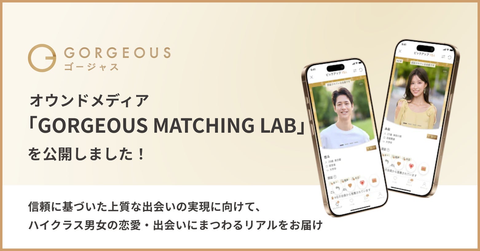 「GORGEOUS MATCHING LAB」は、ゴージャスのブランドコンセプトである「あなたにふさわしい、ハイクラスな出会いを」のもと、ハイクラス層の恋愛・出会いにまつわるリアルと実践的なノウハウを、独自の調査データ・インタビューコンテンツを通して発信していきます。