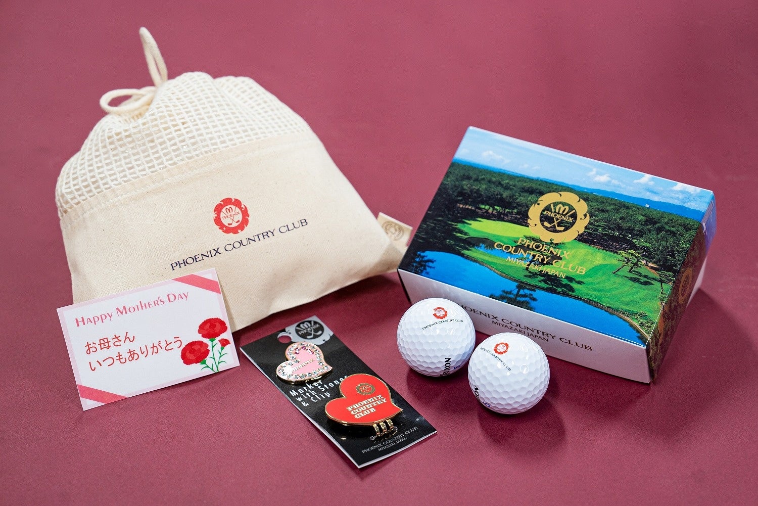 フェニックスカントリークラブオリジナルのネット巾着、マーカー、ゴルフボール(6球入り)の3点セットを特別にご用意。ネット巾着は、ティやボール入れに最適!ハート型のマーカーは、赤・白お好きな色をお選びいただけます。オプションで母の日メッセージカードもご用意いたします。