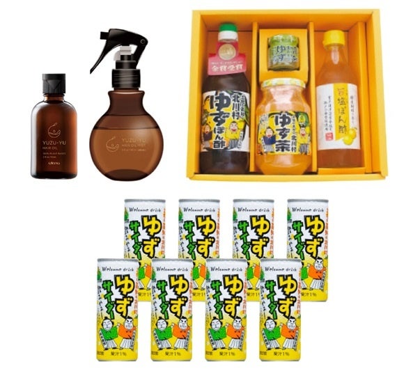 「ゆず油」ヘアオイル、「ゆず油」オイルミスト、北川村ゆずサイダー8本、ぽん酢、ゆず茶、ゆずごしょう、旨塩ぽん酢