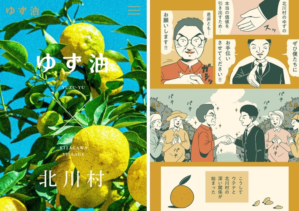 そんな「ゆず油」製品の開発秘話を、SNSで人気の漫画家うえはらけいたさんの書下ろしマンガで公開します。北川村の村長と「ゆず油」担当者が出会い、ともに商品を作り上げた開発ストーリーです。