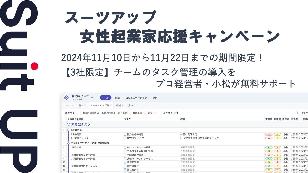2024年11月10日から11月22日までの期間に、スーツアップの無料お試し30日にお申込みいただきました、創業5年未満の女性起業家が社長を務める会社のうち3社限定で、当社代表者であり中小・中堅企業やスタートアップのバリューアップに実績のあるプロ経営者の小松自ら、チームのタスク管理の導入サポートを無料で行うキャンペーンを実施します。