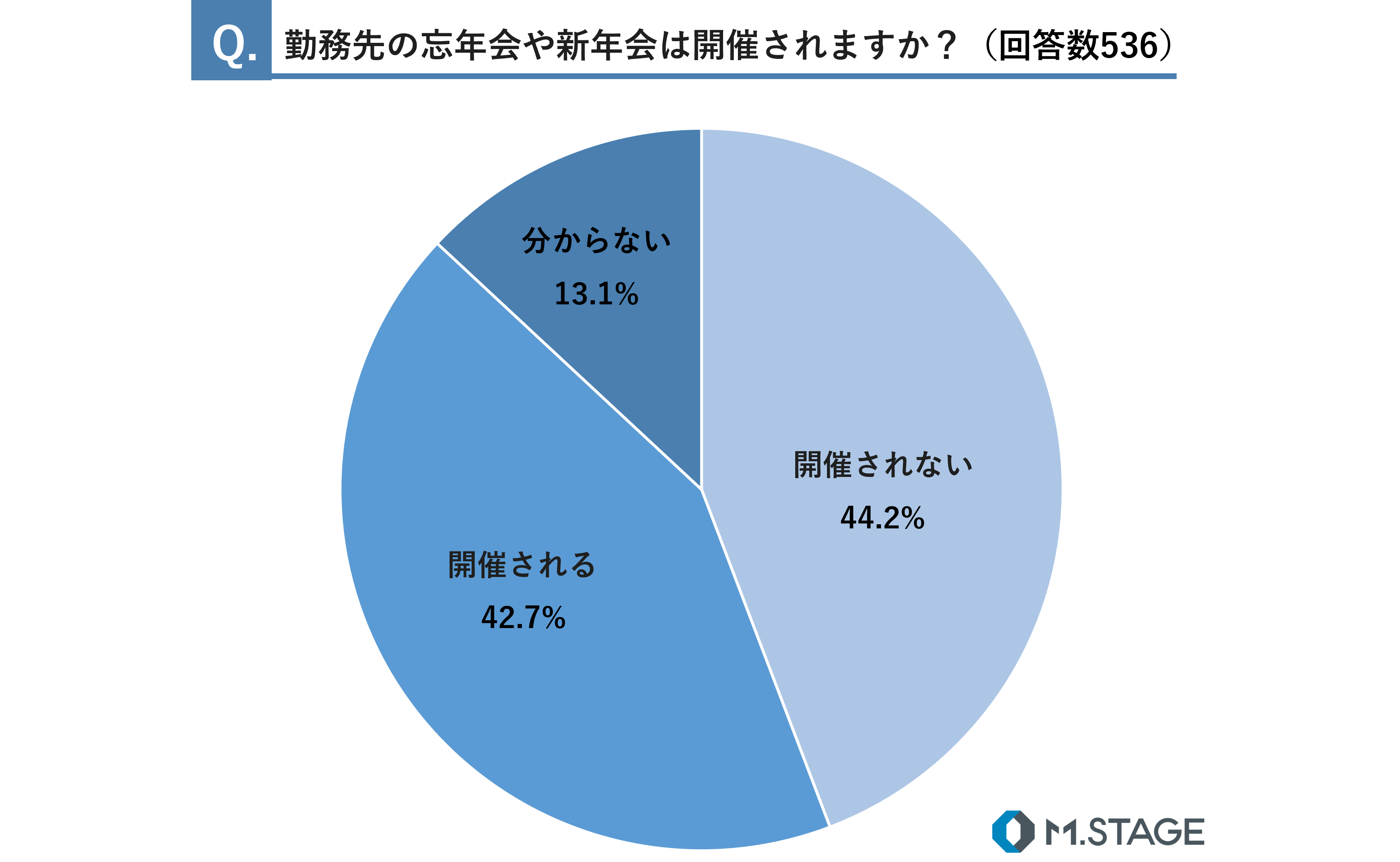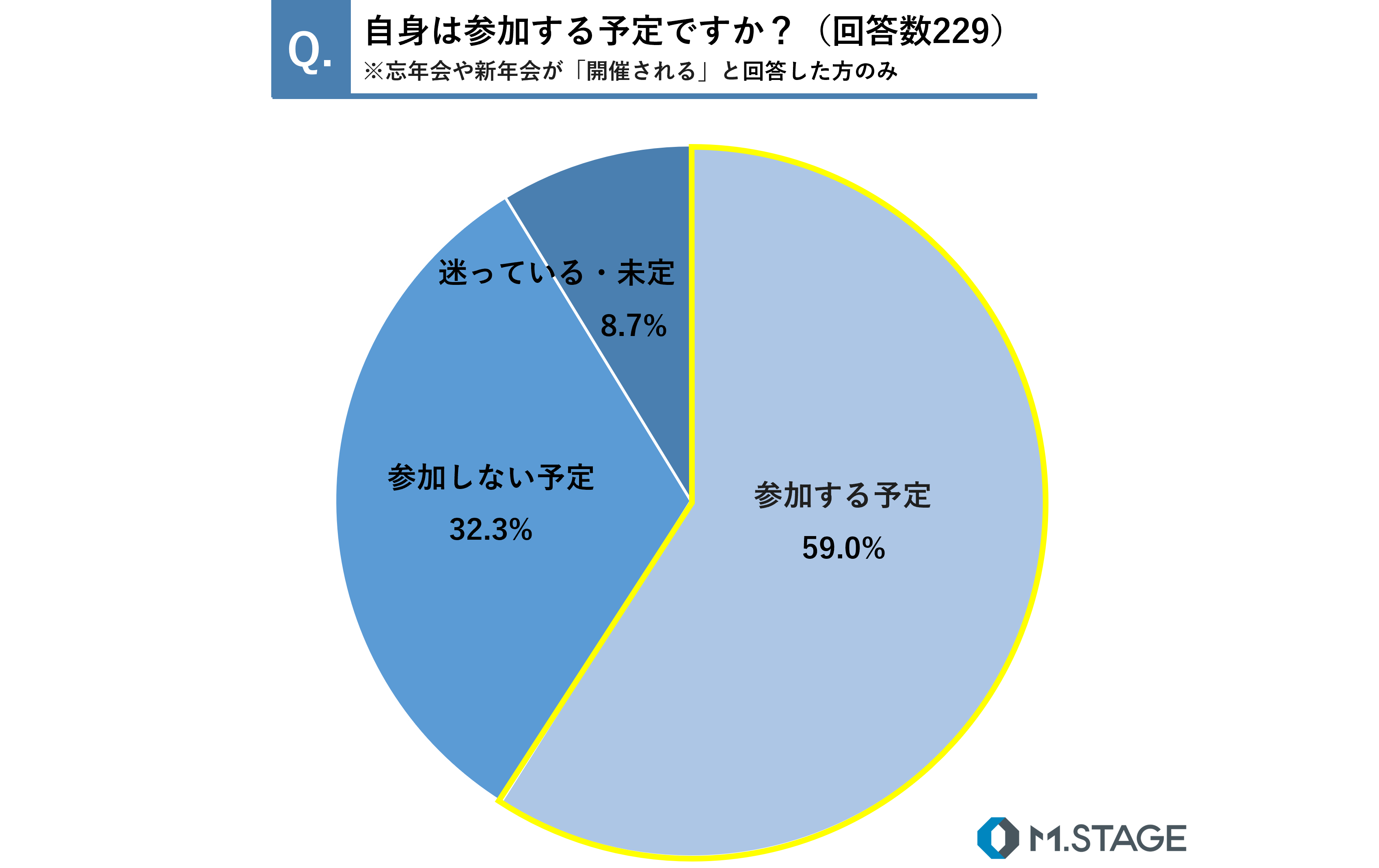 勤務先での忘年会や新年会に関して、44.2%の医師が「開催されない」42.7%の医師が「開催される」と回答。実施の有無はほぼ同じ割合という結果になりました。また、開催される予定と回答した医師の59.0%が「参加する予定」と回答。反対に、32.3%の医師が「参加しない予定」と回答しました。