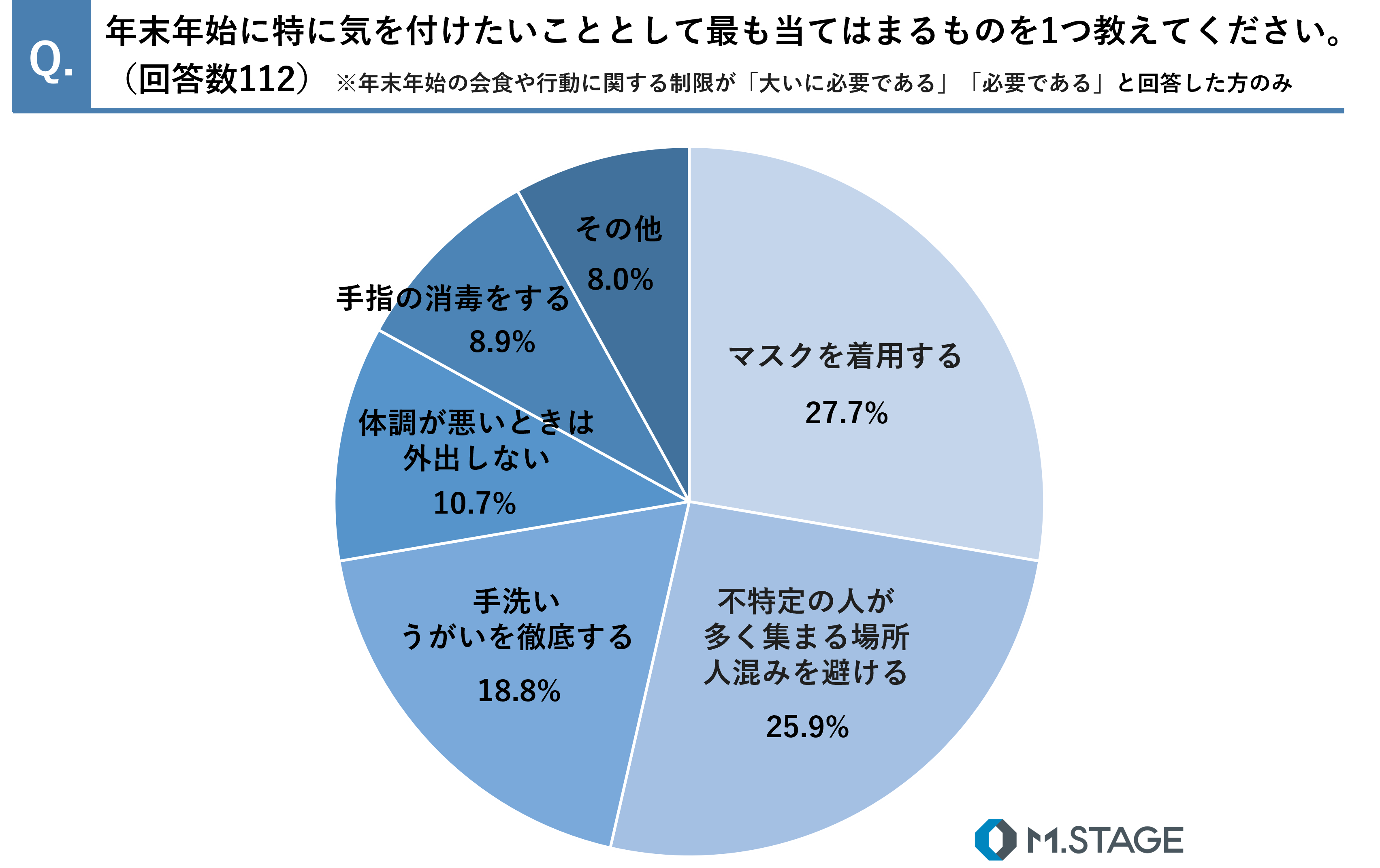 年末年始の会食や行動に関する制限が「必要である」と回答した医師が、年末年始に特に気を付けたいこととして「マスクを着用する」という回答が27.7%で最も多い結果となりました。その他「不特定の人が多く集まる場所・人混みを避ける」は25.9%「手洗いうがいを徹底する」は18.8%「体調が悪いときは外出しない」は10.7%「手指の消毒をする」は8.9%という結果となりました。