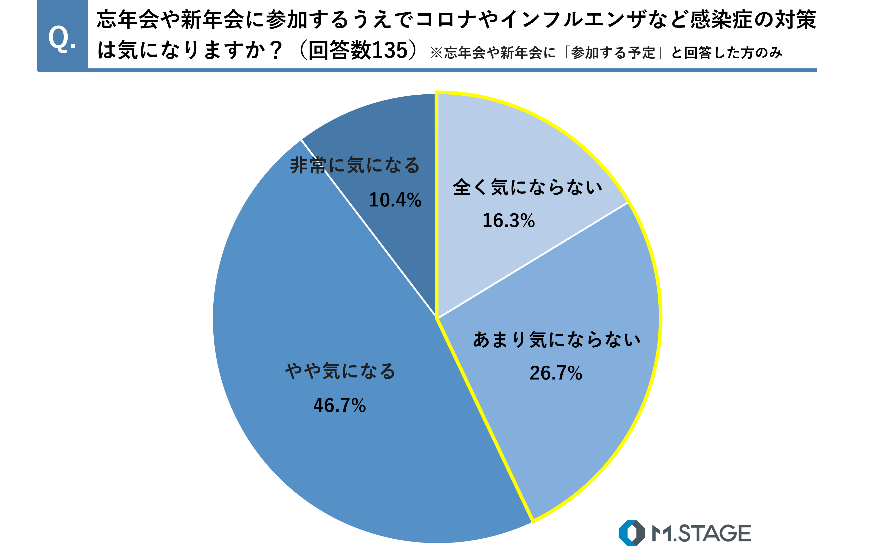 忘年会や新年会に参加するうえで、新型コロナウイルスやインフルエンザなどの感染症の対策が「全く気にならない」と回答した医師は16.3%「あまり気にならない」と回答した医師は26.7%となり、43.0%の医師が感染症の対策は「気にならない」という結果になりました。