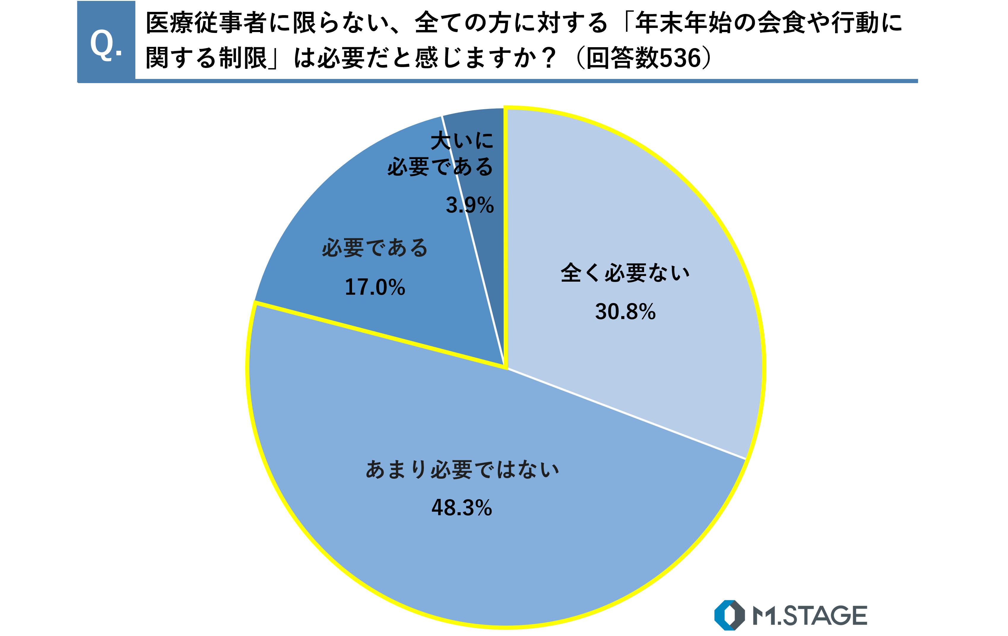 新型コロナウイルスやインフルエンザなどの感染症を意識した年末年始の会食や行動に関する制限では、30.8%の医師が「全く必要ない」48.3%の医師が「あまり必要ない」と回答。約8割の医師が年末年始の制限は「必要ない」と感じている結果となりました。