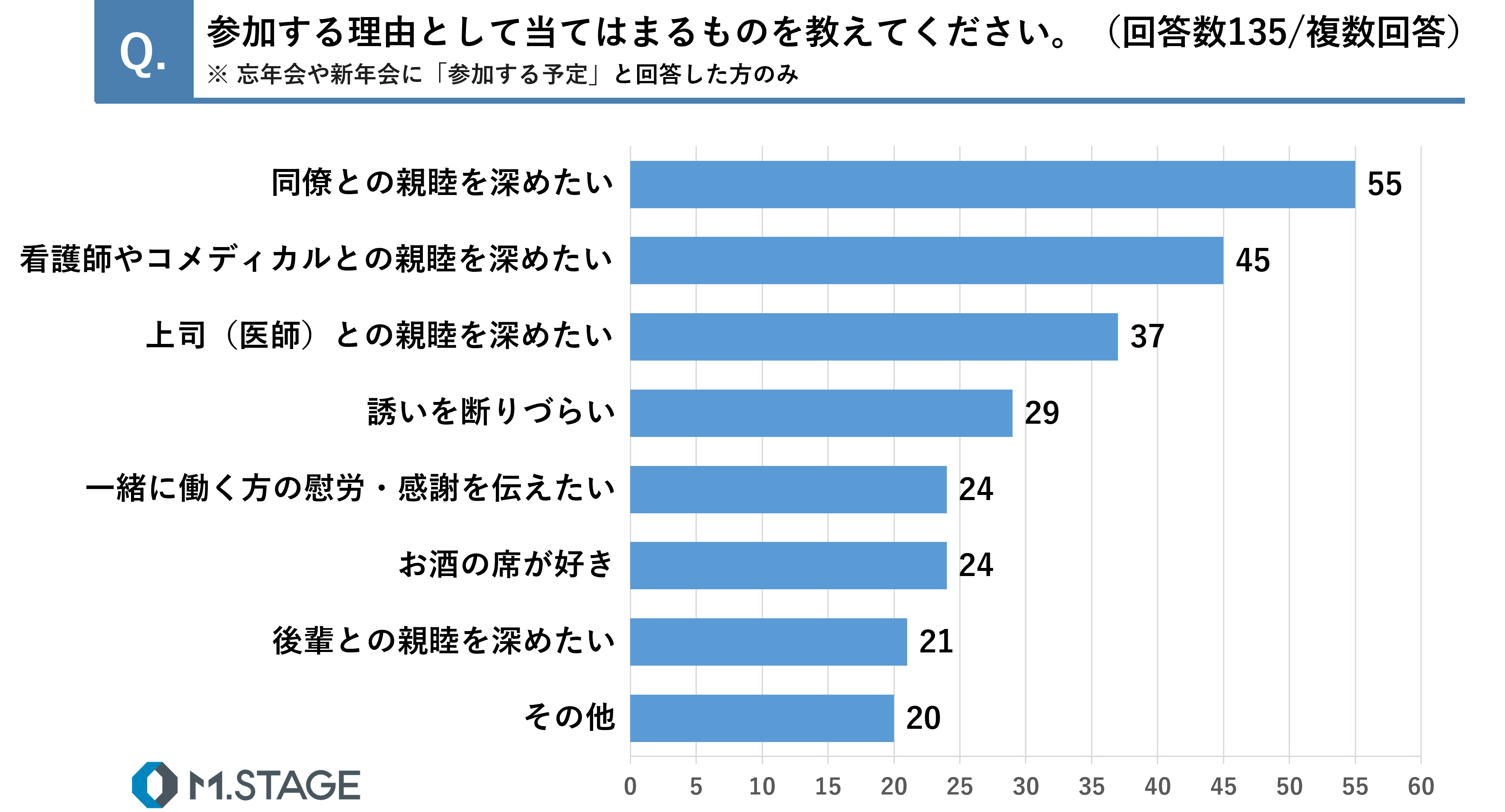 「参加する予定」と回答した医師の参加理由として、「同僚との親睦を深めたい」(55)が最も多く、次いで「看護師やコメディカルとの親睦を深めたい」(45)、「上司(医師)との親睦を深めたい」(37)が続く結果となりました。回答のなかには「誘いを断りづらい」(29)というものもあり、21.5%の医師が断りづらいと感じていることがわかりました。