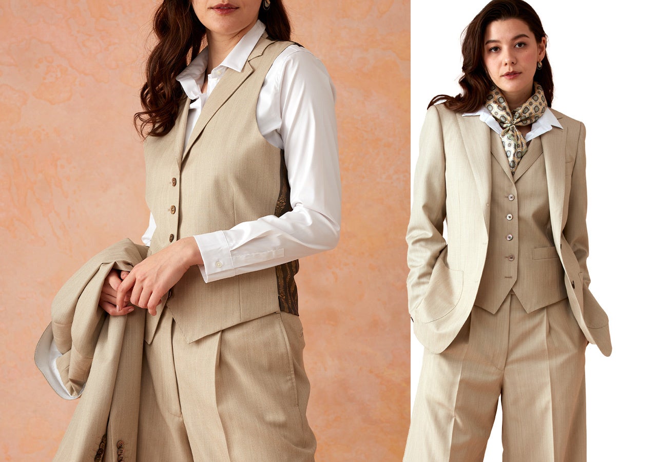 上品な印象の明るめベージュ生地のスリーピーススーツ。ワイドパンツ風アレンジで個性的なスーツスタイルに。