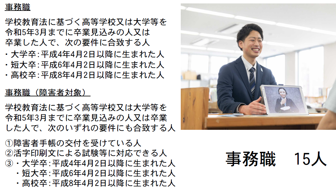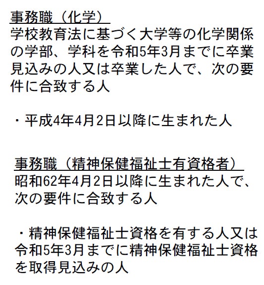 - 事務職(障害者対象、化学、精神保健福祉士有資格者含む)15人
