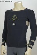 着ることで心拍測定が行えるウェアラブルのホールガーメントプルオーバー、絶縁被覆導電性繊維を使用した、指先の接触を検出するホールガーメント手袋、絶縁被覆導電性糸を編み込み、スイッチの機能として使用したホールガーメントニットアクセサリーを展示。