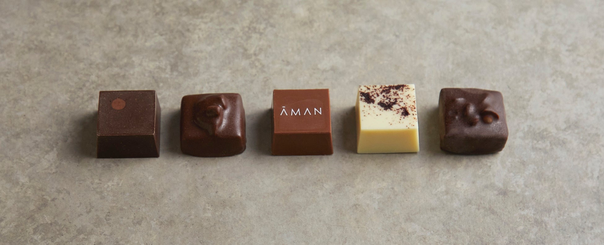 新フレーバーのアマンロゴ入りチョコレートは、ラ・パティスリー by アマン東京のシグニチャーケーキのひとつである「アマン東京モンブラン」で使用している熊本県産和栗のペーストに、フランス マルティニーク島産のラム酒とホワイトチョコレートを合わせた風味豊かなガナッシュを、ミルクチョコレートでコーティングしました。他にも、大粒の長野県産オーガニックくるみや、青森県産カシスとマール ド シャンパーニュ、国産レモンとスパイスなど、5種類のフレーバーをお楽しみいただけます。それぞれの素材に合わせてカカオを厳選し、ひとつひとつ丁寧に手作りすることで、シンプルでありながらも奥深い味わいのチョコレートに仕上げています。