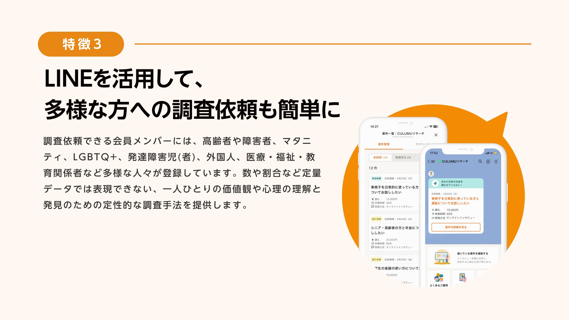 CULUMUリサーチは、企業や自治体のインクルーシブな取り組みを支援する中で生まれました。このサービスは、高齢者、障害者、外国人など、これまで見過ごされがちだった多様な人々とのマッチングを実現し、インクルーシブな製品やサービスの開発を加速することを目指しています。このプラットフォームを通じて新しいアイデアやイノベーションを共に創造できることを願っています。