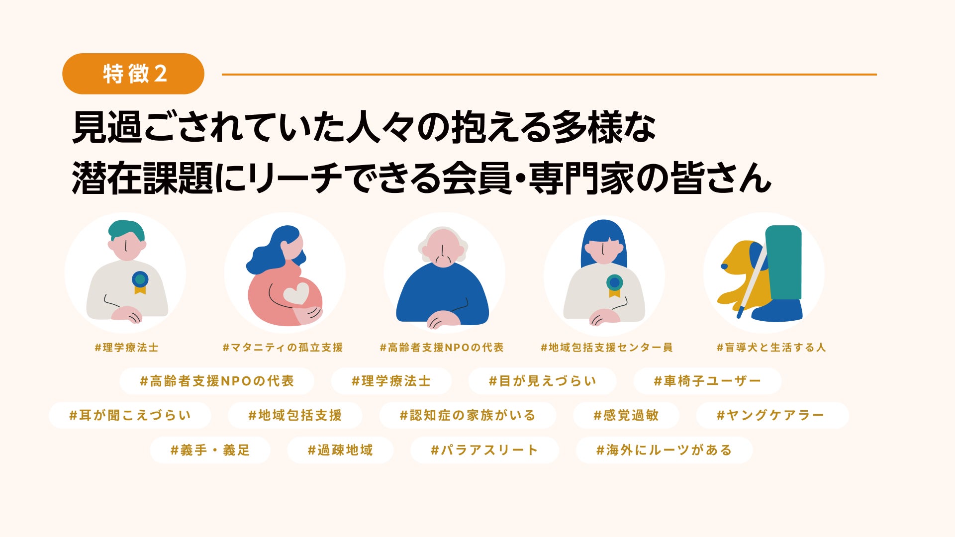 4,000団体以上のNPO・NGOとの繋がりを通じた希少なN=1が多く集まる調査パネルを基に、これまでリーチが困難であった人々を含む多様な人々とマッチングと定性的な調査手法を提供します。