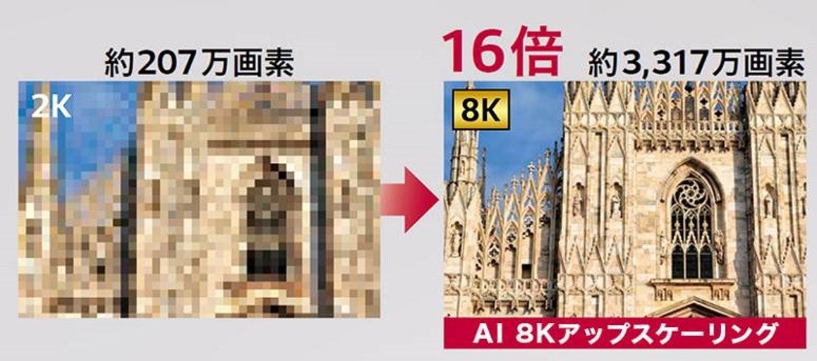 映像エンジンは、何百万もの映像ソースを学習したリアルタイムAIプロセッサーが第5世代に進化し、地上波放送の2Kおよび4K解像度の映像も8K水準の画質へとアップスケーリング。