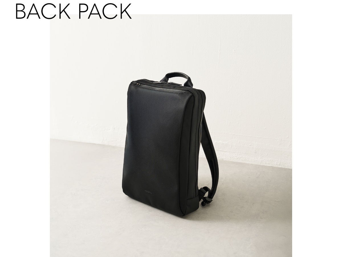 たっぷり入るスクエアシルエットのバックパックは、ビジネスシーンでも大活躍。奥行は9cmとスリムながら、内側に大小さまざまな仕分けが施されており、荷物の“定位置”を振り分けるだけで使い心地も動作もスマートな印象に。