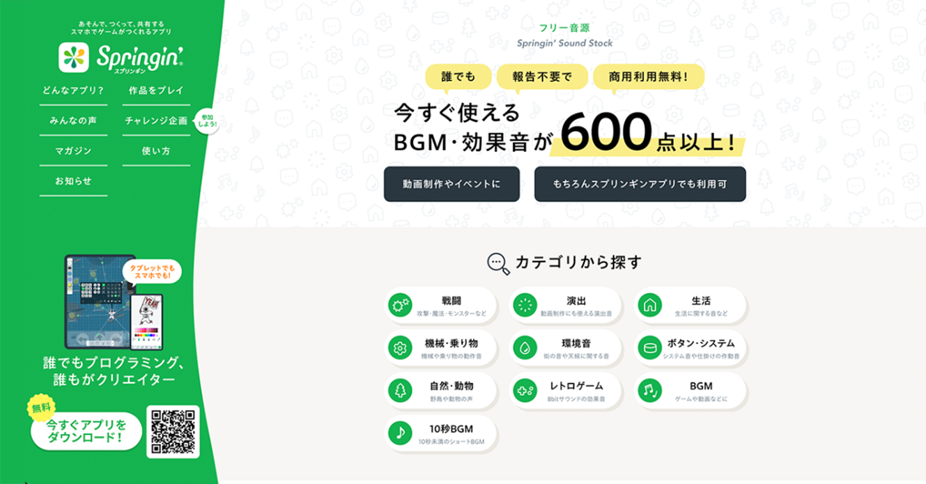 この度、新たなクリエイター支援として「音」素材が無料で使うことが出来るフリー音源ストックサイト「Springin’ Sound Stock(スプリンギンサウンドストック)」を本日よりオープンいたしました。