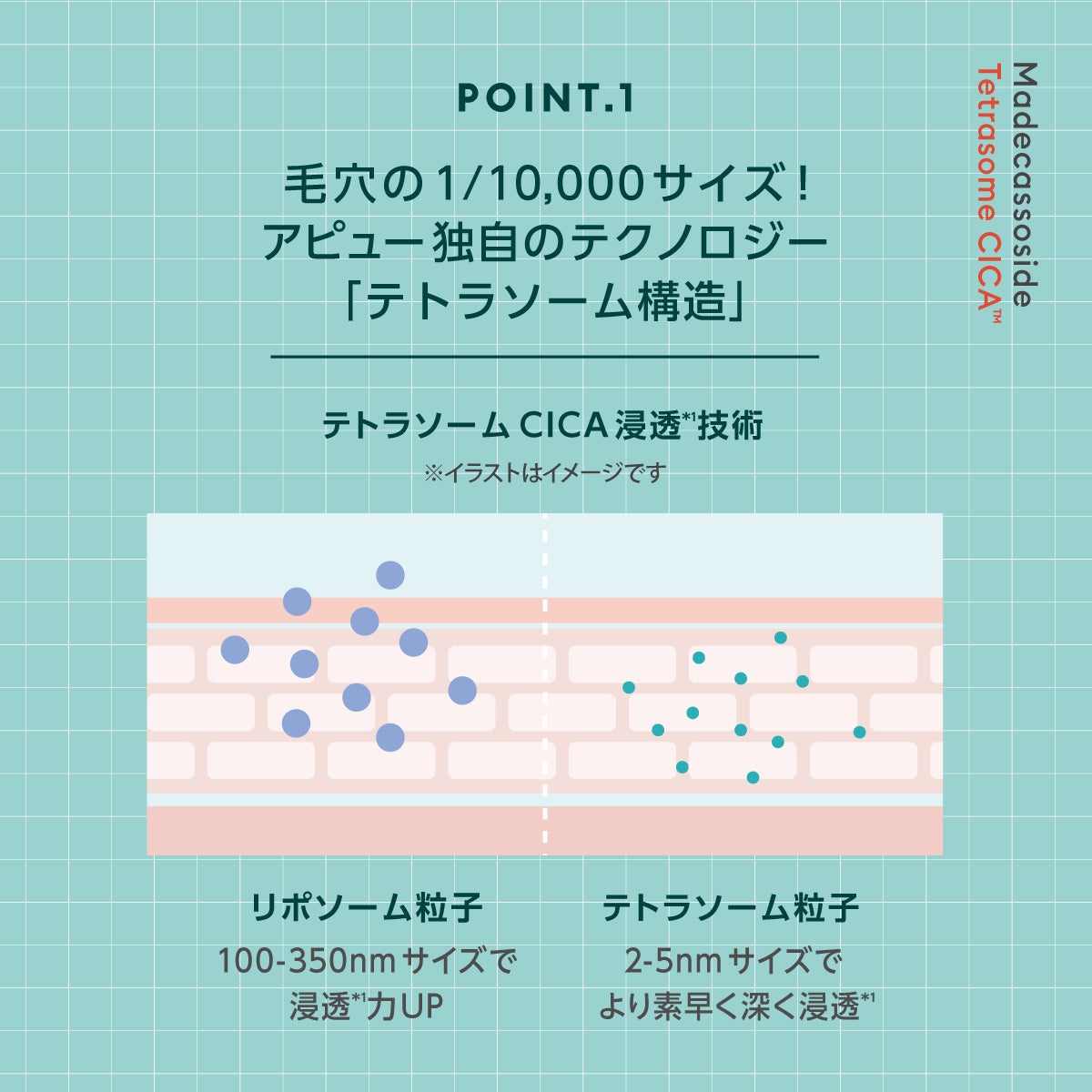 テトラソーム技術とは、リポソーム粒子をさらに1/60サイズにした粒子のことで、肌への親和性を高めるため、アピュー独自で開発された浸透*¹技術のことです。これにより、親水性と親油性の2つの性質を持ち、より素早くCICA*成分が肌に浸透*¹します。