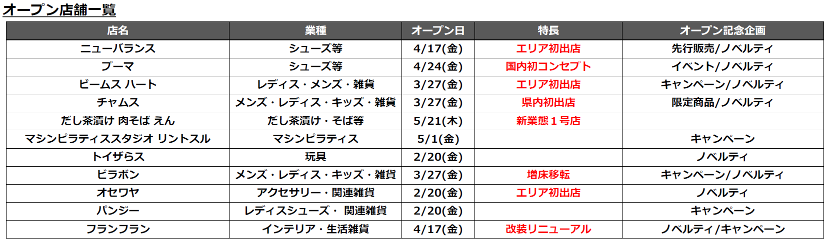 今春は、昨年オープンした「ナイキ」に加え、エリア初出店となる「ニューバランス」や、「プーマ」の国内初コンセプトストアなど、人気海外スポーツブランドが集結する新ゾーンが誕生いたします。また、エリア初出店の「ビームス ハート」、県内初出店の「チャムス」、新業態1号店となる「だし茶漬け 肉そば えん」など、ここでしか出会えない魅力あるブランドが、さらに充実します。そのほか、「マシンピラティススタジオ リントスル」、「トイザらス」、「ビラボン」の増床移転、「オセワヤ」のエリア初出店、「パンジー」、「フランフラン」の改装リニューアルを含む、全11店舗が順次オープンいたします。