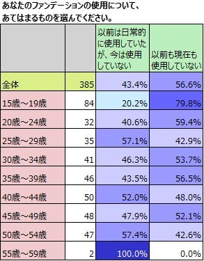 ファンデーションを使用していない女性に、ファンデーションの使用歴を聞きました。以前も今も使用したことのない女性は、5割を超え、10代から20代前では、特にまだファンデーションを使用したことがないという女性が多く、年齢を重ねるにつれ、「以前は使用していたが、今は使用していない」と答える女性が増える傾向にあります。