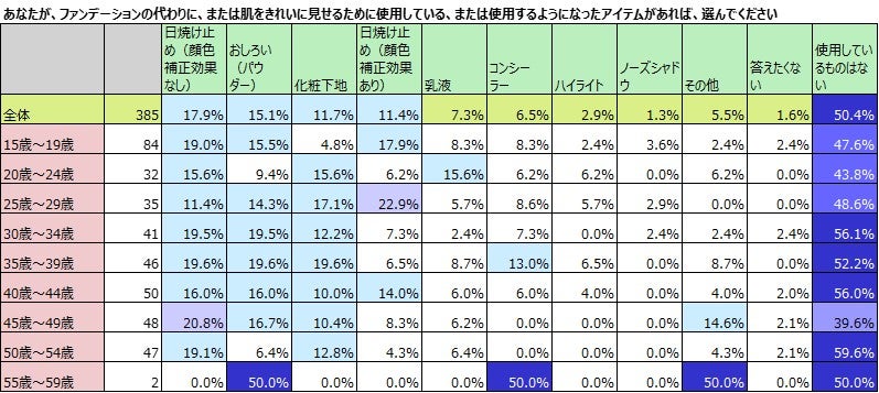 ファンデーションを使用していない女性が、ファンデーションの代替品として使用しているアイテムは、1位が「日焼け止め」で、顔色補正機能があるものとないものを合わせると、全体では、29.3%と、約3割の女性が使用しています。2位は、15.1%の「おしろい(パウダー)」、3位は11.7%の「化粧下地」と続き、ファンデーションを使用しないからと言って、何も使用していないのではなく、ファンデーションの代わりに、約半数の女性は何らかのアイテムを使用しているようです。特に40代後半の世代の女性は、6割の女性が何らかのアイテムを使用しており、日焼け止めの使用率も高いことが伺えます。