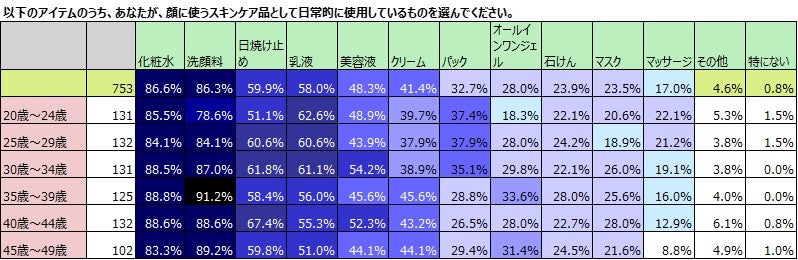 スキンケアアイテムの使用率について、全国の20歳~49歳の753名の女性に聞きました。30代以降は、乳液と日焼け止めの使用率の順位に逆転が生じ、乳液の使用率よりも日焼け止めの使用率が高くなります。また、年齢を重ねるにつれ、その比率に開きが生じ、日焼け止めの使用率が上がっていく傾向が見られます。