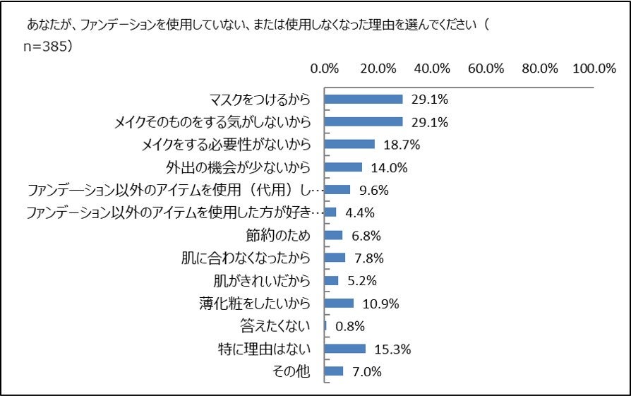 また、ファンデーションを使用しない、または、使用しなくなった理由としては、「マスクをつけるから」・「メイクそのものをする気がないから」が同率の1位で、約3割に迫ります。マスク着用によるファンデーション離れと、メイクをするモチベーションが下がったことが伺え、コロナによる影響を強く感じます。ただし、ファンデーション以外のアイテムを代替として使用している女性や、薄化粧でいたいという女性も約1割で、それぞれの女性がTPOや気分に合わせてメイクをしているようです。