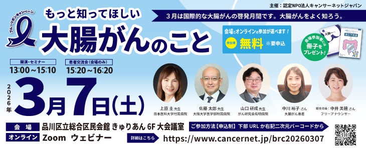 認定NPO法人キャンサーネットジャパン(所在地:東京都文京区、理事長:岩瀨 哲、以下CNJ)は、2026年3月7日(土)、大腸がん疾患啓発活動「ブルーリボンキャンペーン」の一環として、市民公開講座 「もっと知ってほしい大腸がんのこと」 を、東京会場およびオンラインによるハイブリッド形式で開催いたします。