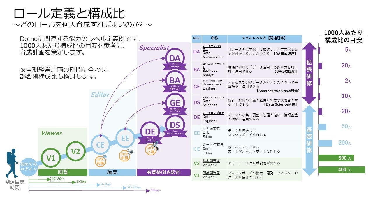 ドーモは、データアンバサダー養成講座を含め、包括的なデジタル人材育成プログラムを提供します。プログラムでは、データ人材を育成するまでのステップや目標のレベルにたどり着けるまでの所要期間、そして、各ロールの定義からその構成比率を検討していきます。さらに、顧客企業はDomoを活用して従業員の受講状況や学習効果の分析をすることできます。従業員の成長過程を把握して、誰も躓くことなく、自走できるまで伴走する仕組みを作り上げています。