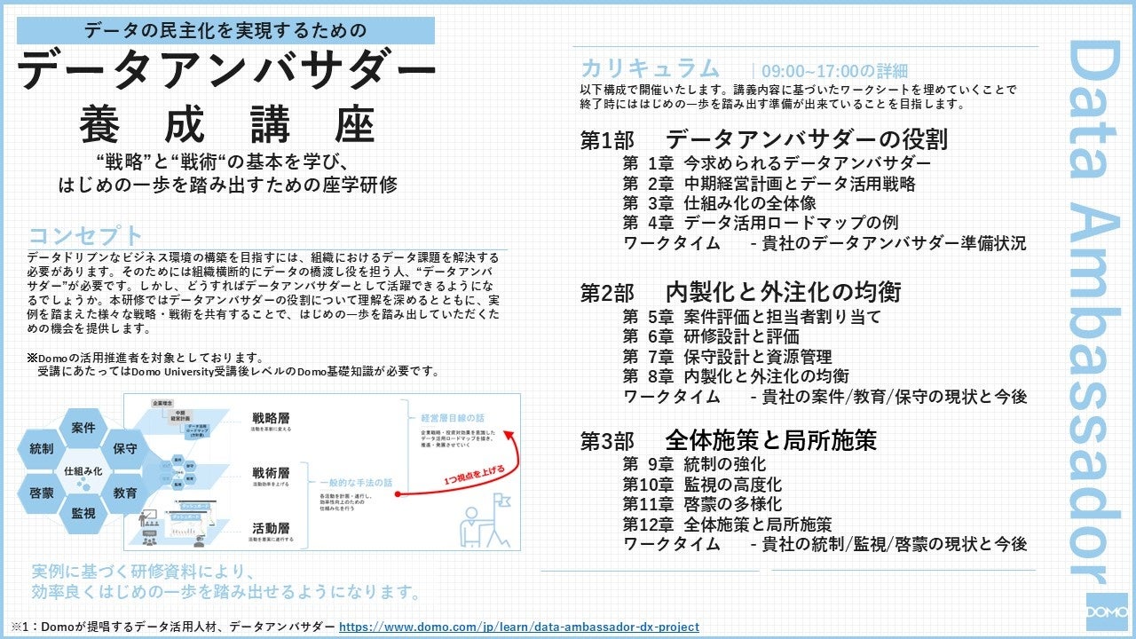 クラウド型データ活用プラットフォーム「Domo」を提供するドーモ株式会社(本社:東京都渋谷区、プレジデント ジャパンカントリーマネージャー:川崎友和、以下ドーモ)は、DX推進を成功に導く人材を育成する「データアンバサダー養成講座」を含む包括的な人材育成プログラムの提供を開始したことをお知らせします。