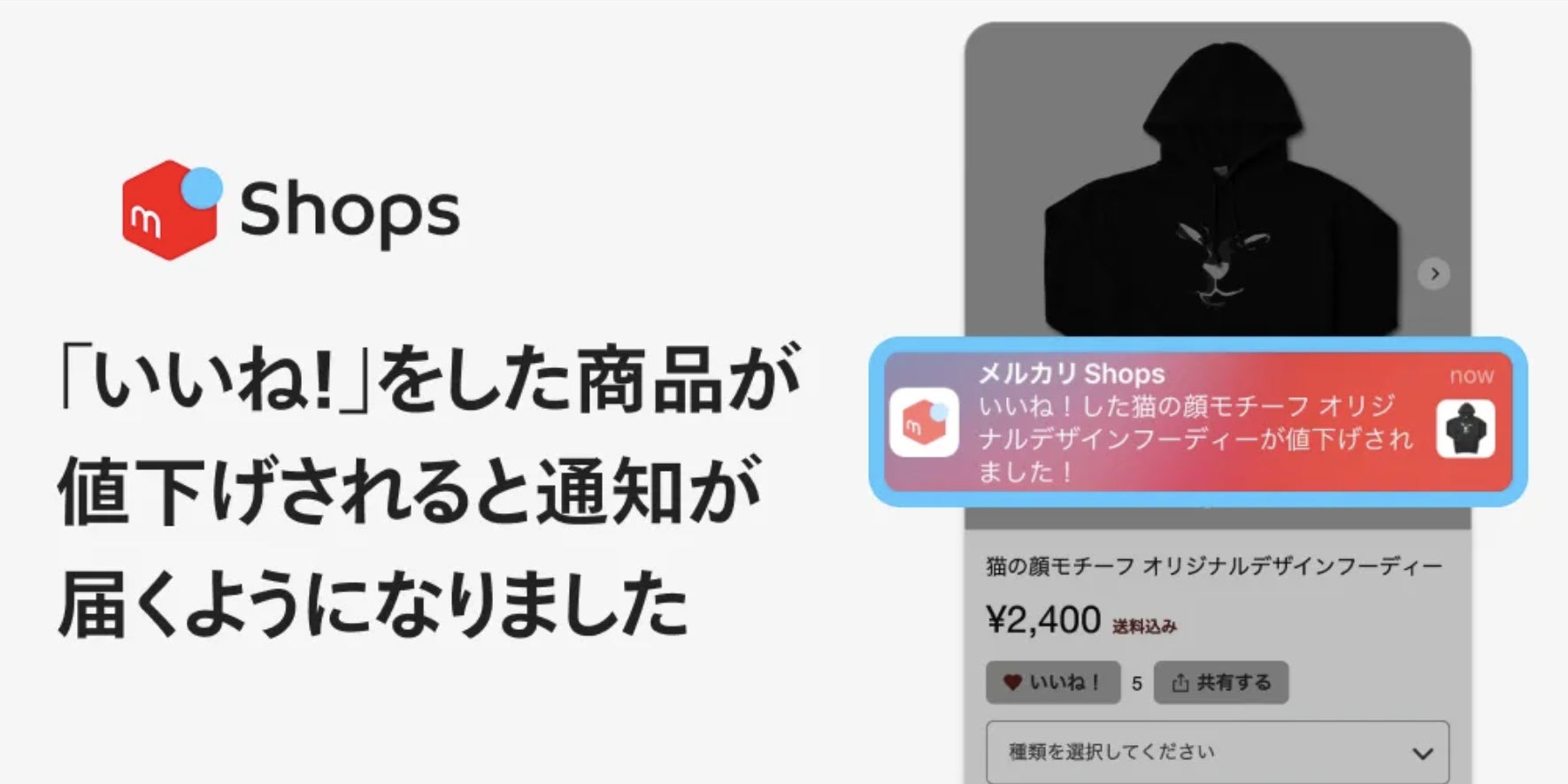「メルカリShops」では、気になる商品に「いいね!」をすると、「いいね!」をしたタイミングよりも商品価格が安くなったときに、メルカリアプリを通じてお知らせがきます。
