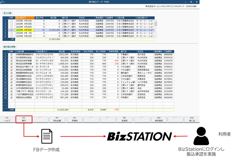 債務・支払管理業務から振込業務までをシームレスに利用(※)でき、具体的には、「奉行クラウドシリーズ」から銀行振込用のデータを作成すれば、ワンストップでBizSTATIONへの振込データが連携され、支払業務がより効率化されます。