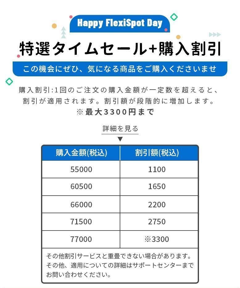 ※購入割引にはカート[小計(税込)]を基づきます - 特設URL:https://flexispot.jp/525fsday