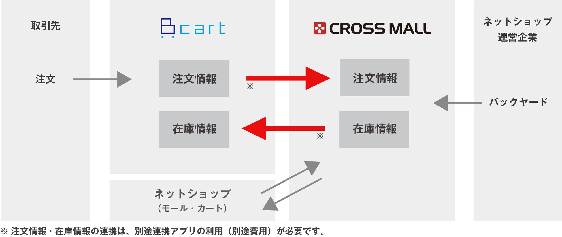 このたびの連携により、「Bカート」を利用し複数ネットショップを展開している企業さまは、「CROSS MALL」が管理している注文情報を反映することで、随時更新されている在庫数を「Bカート」の在庫数と共有することが可能となり、在庫を一元管理できます。