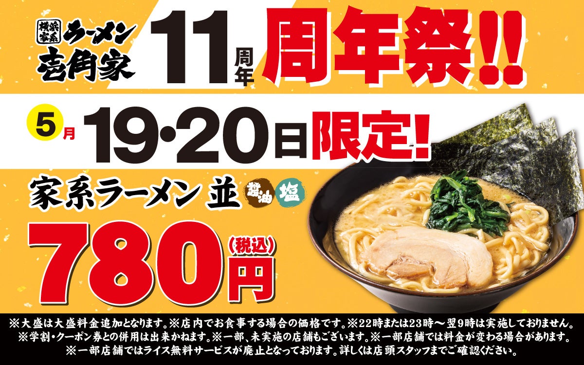 株式会社ガーデン(本社:東京都新宿区 代表取締役社長:川島賢 以下「当社」)が運営する「壱角家」は、壱角家ブランド11周年を記念して、2025年5月19日(月)、20日(火)※限定で「家系ラーメン並」を税込780円で提供する「壱角家11周年祭」を実施いたします。ぜひこの機会に壱角家の家系ラーメンをお楽しみください。
