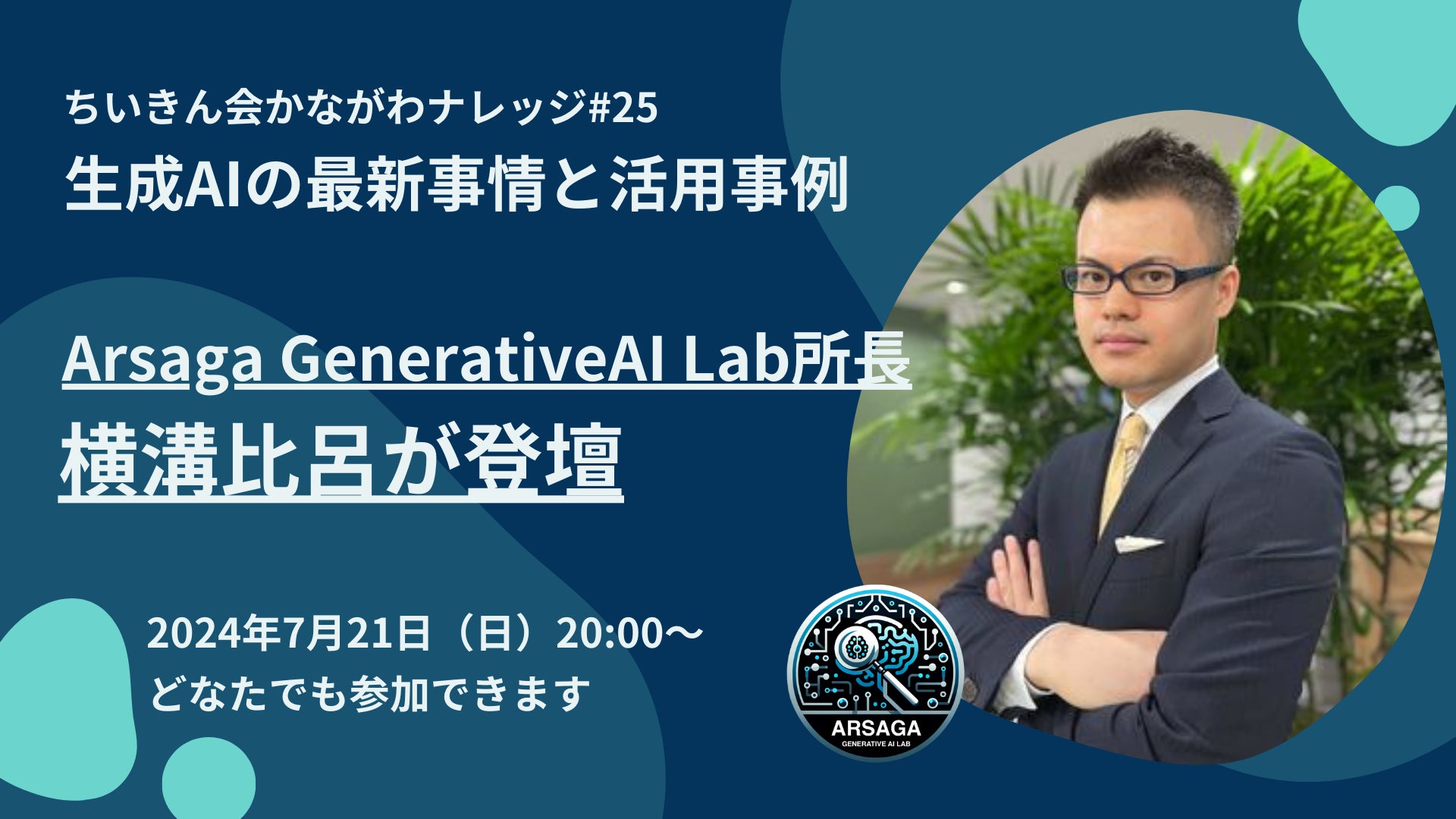 企業のDXを促進するアルサーガパートナーズ株式会社(本社:東京都渋谷区、代表取締役社長 CEO/CTO:小俣泰明、以下「アルサーガパートナーズ」)のArsaga GenerativeAI Lab所長を務める横溝比呂が、2024年7月21日(日)に開催される「ちいきん会かながわナレッジ」の定例勉強会に登壇します。本イベントは、官•金•民の多様なメンバーが集まり、経営支援や地域の課題解決等の学ぶコミュニティであり、Zoomを利用したオンライン形式で行われます。