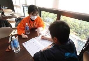 食後の自由時間では、子どもたちが持参した宿題を学生のお兄さん、お姉さんに教えてもらったり、カードゲームで遊んだり、お話しするなど、お互いすっかり打ち解けた様子で楽しんでいました。すっかり打ち解けた子どもたちの笑い声が食堂スペースに溢れる時間となりました。