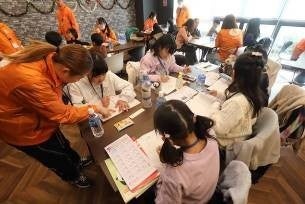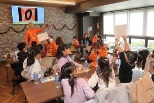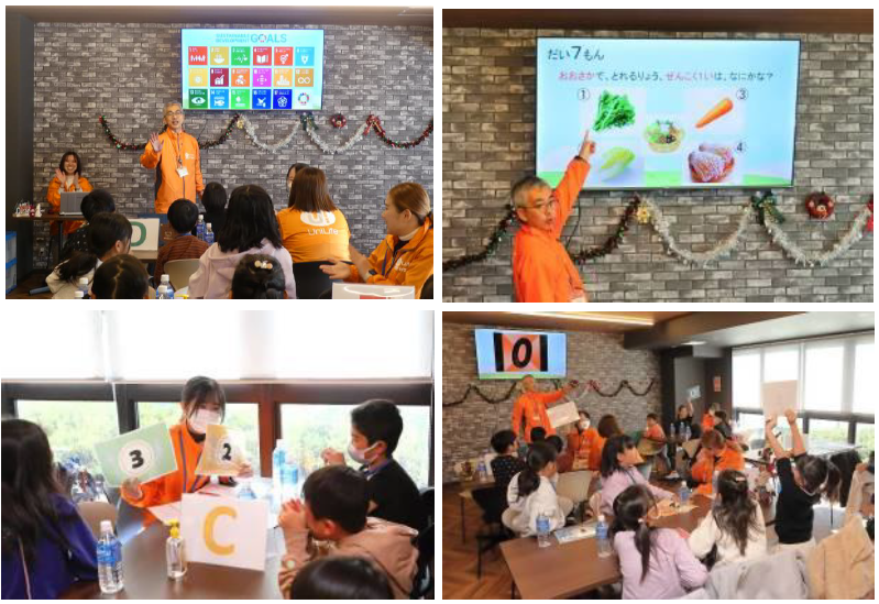 食育・フードロスについて学ぶ時間では、子どもたちが楽しく学べるようにクイズ形式の学習メニューを実施しました。初対面で恥ずかしがるお子さんもいらっしゃいましたが、学生や子どもたちで色々と話し合っていくうちに、次第に打ち解け、仲良くなっていきます。小学生が年間に給食を何キロ残すのか?大阪府民が食事に掛ける時間の長さは都道府県別で何位?などの問題が出され、正解が発表される度に各テーブルは盛り上がり、アイスクリームに賞味期限はないという正解には特に驚いた様子でした。昨年に引き続き、SDGsやフードロスについて知っている子どもも多く、社会課題に対する認識の広まりを感じました。
