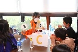 ”学びのマンション”でのイベントのひとつである『楽しく学ぼう!もぐもぐ食堂』は2022年11月に初開催され、今回で2回目の開催となります。参加学生はイベント運営のボランティアスタッフとしての役割を担い、地域の子どもたちと学生との交流のほか、食育・フードロスをテーマに食の大切さについて学びました。今回参加してくれたのは、学生ボランティア4名と地元の小学生以下の子どもたち16名です。子どもたち3、4名とサポート役の学生1名が1つのチームになってワークを行いました。