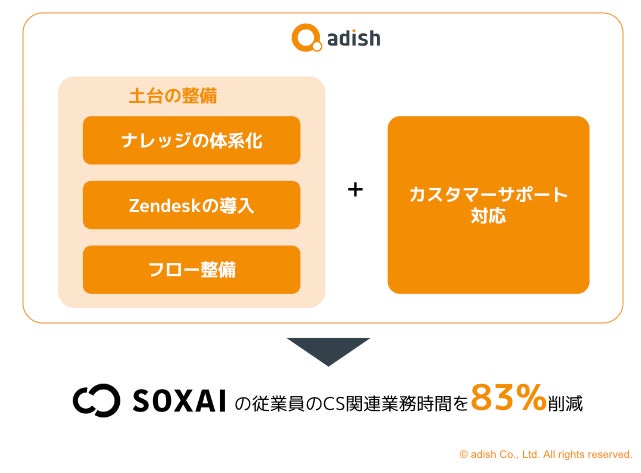 SOXAIの課題である「問い合わせが急増し対応が間に合わない」「カスタマーサポート経験者不在による顧客離れ」「カスタマーサポート体系の設計や対応フローの構築が後回し」に対してアディッシュは、スケーラビリティの高いカスタマーサポートを実現するため、「ナレッジの体系化」「対応フローの整備」「カスタマーサービスプラットフォームZendeskの導入」などによる業務効率化につながる支援を実施しました。