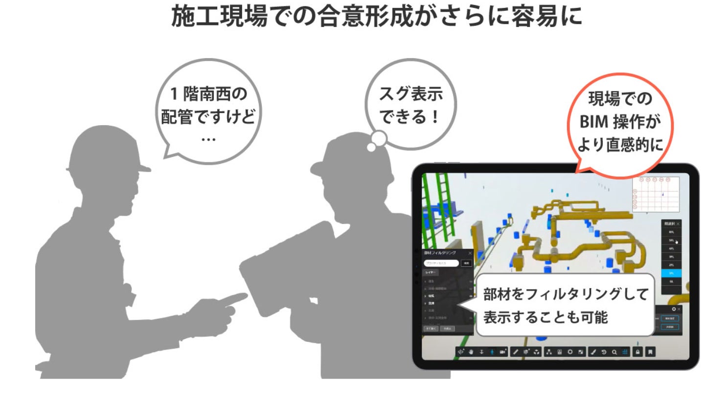 3Dモデル内で視点を高速移動させられることから、BIMを用いた直感的な情報把握・共有を効率的にし、施工現場での合意形成をさらに容易にします。
