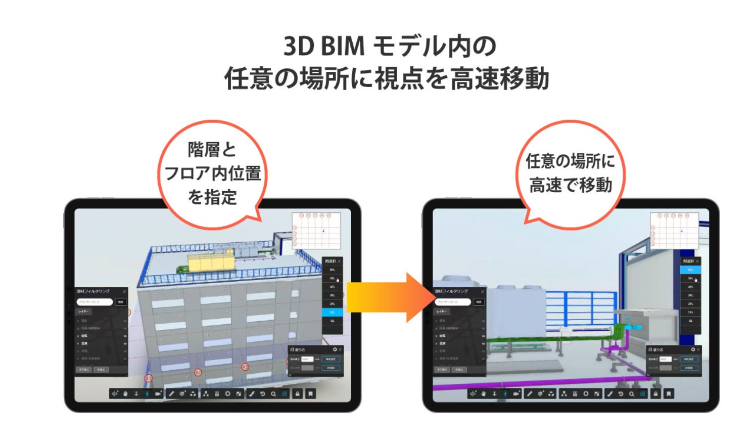3Dモデル内で視点を移動させることは現場の規模が大きくなるほど、モデル内で現在地を把握し、水平位置や任意の階層などの垂直位置までに視点を移動させるのに時間を要していました。