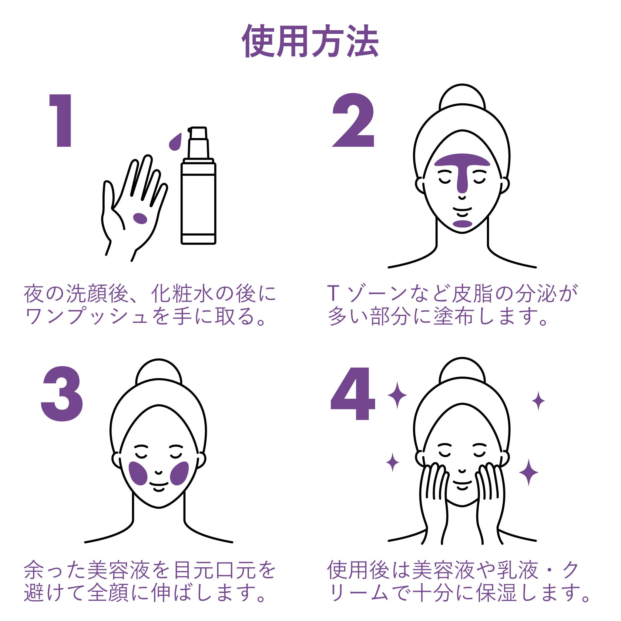 化粧水の後にワンプッシュを手に取り、Tゾーンを中心に目元口元を避けてご使用ください。