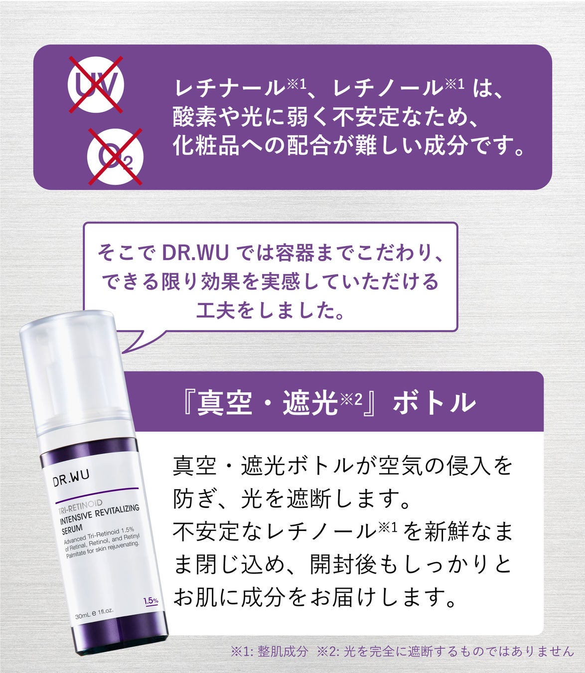 DR.WUのトリレチノイド 1.5% セラムでは、効果をしっかりと感じていただけるよう「真空・遮光ボトル」で成分を守っています。