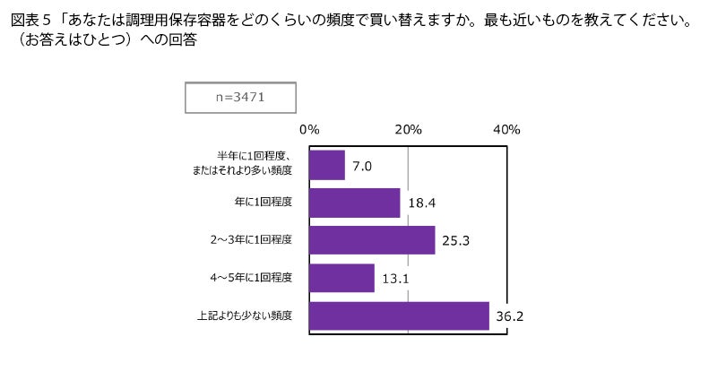 保存容器をどのくらいの頻度で買い替えるかを聞くと(図表5)、5年以上買い替えない人(「上記よりも少ない頻度」)が36.2%と最も高く、その次が「2〜3年に1回程度」(25.3%)でした。