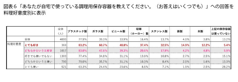 プラスチック製についてはあまり違いがないものの、ほかの種類では使用している人の割合に大きな違いがあります。「とても好き」の人に注目すると、ガラス製については、全体が39.3%に対して60.7%が使用、ホーロー製については、全体が16.4%に対して37.4%、ステンレス製については、全体では13.7%に対して32.5%と、20ポイント前後の差がある項目もあります。これは複数回答可の質問ですから、料理好きな人は、いろいろな種類の保存容器を使い分けていると言えそうです。